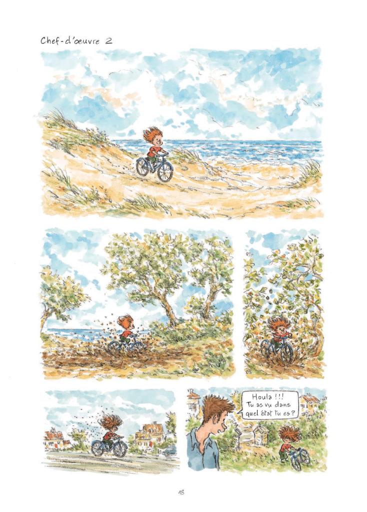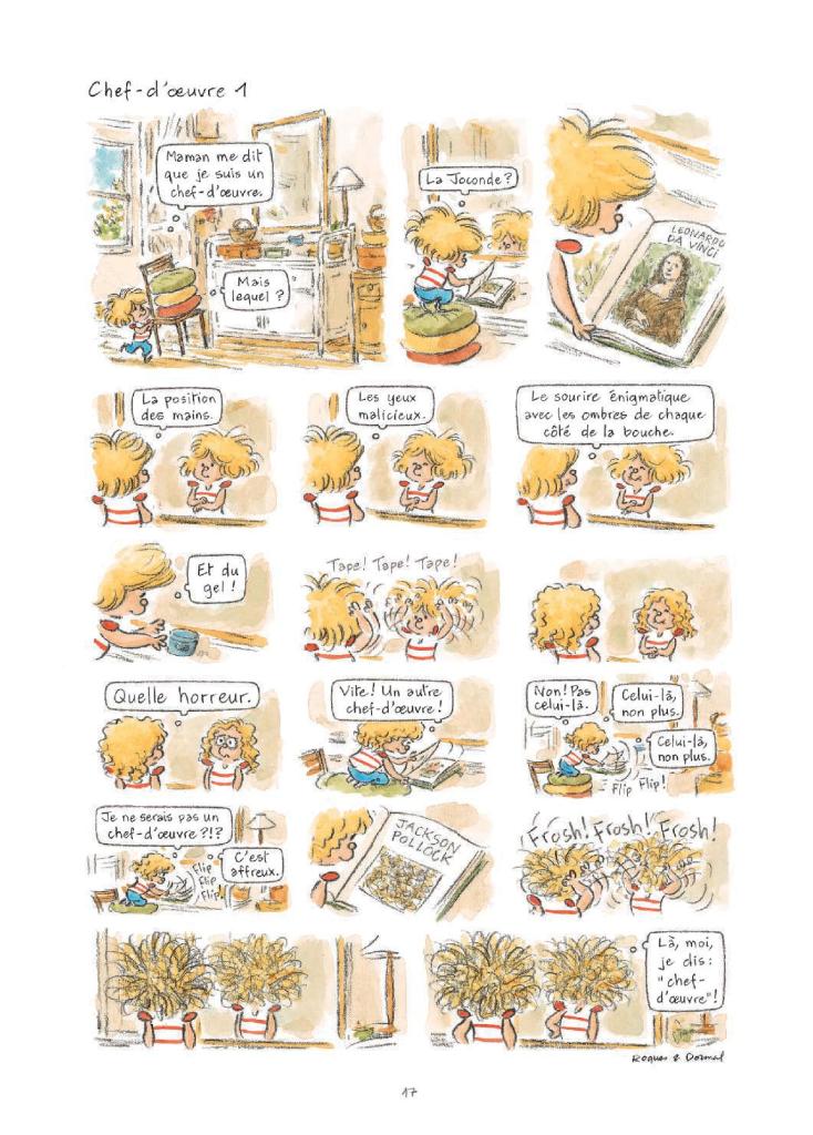 Pico, c’est donc le plus grand. Il avance dans la vie avec toutes les questions, et même plus, qu’un grand (petit) garçon peut se poser sur la vie, la société, le fait de grandir mais aussi sur des objets culturels (les vanités ou La Joconde et « son air satisfait ») et ces drôles d’expressions que nous verbalisons sans nous méfier de la mécompréhension qu’en auront les enfants. Par exemple, l’autre jour, je chantais quelque chose à ma fille de 3 ans quand « j’ai perdu le fil ». « Il est où, il est où, il est où? », m’a-t-elle demandé. De quoi parlait-elle? « Le fil », m’a-t-elle éclairé.