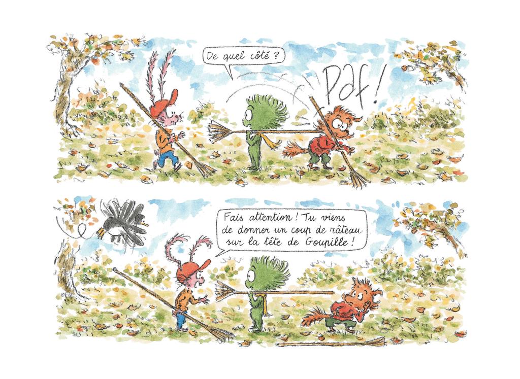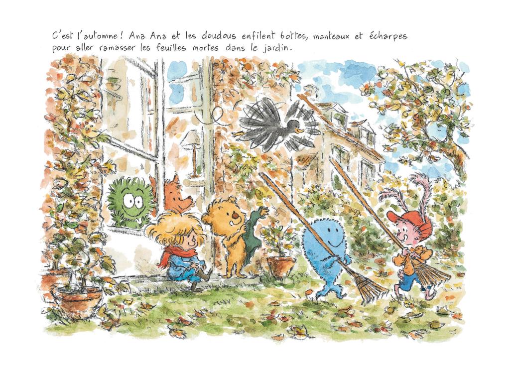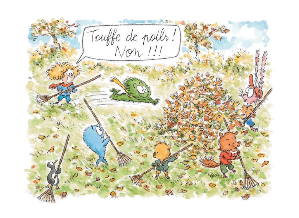 Cela n’empêche qu’il y a des tâches quotidiennes ou de saison auxquelles on ne peut échapper. Ramasser les feuilles mortes, par exemple. Mais avec sept paires de bras et pattes, ça va aller vite, Ana Ana et ses six doudous pourront vite bricoler leur herbier. Sauf que… la paire de pattes du tonitruant Touffe de Poils (sorte de petit Grinch aussi enthousiaste que maladroit, bourrin) ne va pas être d’une grande utilité. Album après album (peut-être est-ce un peu trop récurrent?), il fait pire que mieux. Ça va encore mal finir, jusqu’à ce que tout soit pardonné, une fois les bêtises bien juteuses et collantes nettoyées. Car, forcément, Touffe de Poils ne va pas faire son herbier comme les autres.