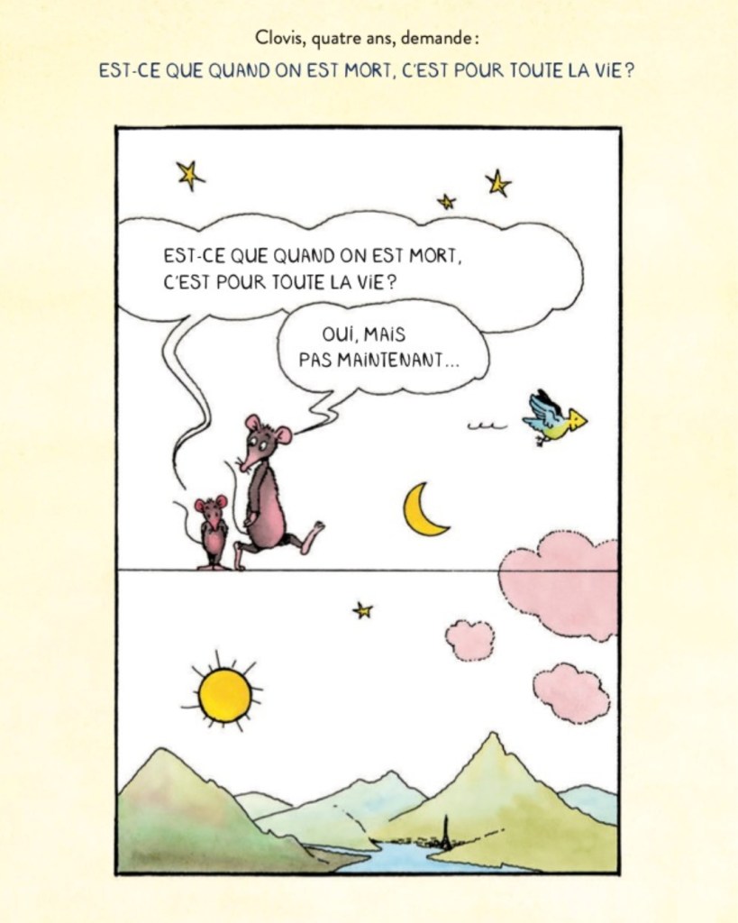 Claude Ponti a carte libre mais est limité à une page (en un dessin ou en plusieurs strips) et quasiment exclusivement à ses personnages souris pour (tenter de) répondre à toutes les « devinettes » de ces jeunes lecteurs, ayant entre trois ans et demi et dix ans. Oh, les réponses décapantes de poésie, sautillantes et enfantillantes, implacables de logique, sont inédites et certainement pas référencées dans un quelconque dictionnaire. Si ce n’est donc dans ce petit Ponti illustré qui transforme chaque exercice en expérience de lecture et de vision singulière. Masterclass.