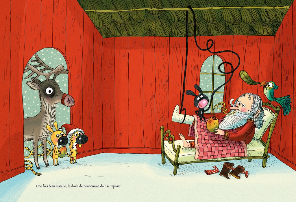 La deuxième, c’est celle que tout ce petit monde va faire avec un bonhomme tombé du ciel, avec des cadeaux, un traîneau et la drôle de gazelle volante qui le tractait. Tout a chuté, emberlificoté dans la neige et les branches des palmiers. Quant au Monsieur à la longue barbe blanche et tout de rouge vêtu, il a sûrement une jambe cassée. Sa légende n’est pas parvenue jusqu’ici, mais tels des dizaines de rois mages, les animaux exotiques se pressent à son chevet pour lui offrir des fruits, de quoi le remettre sur pied très vite mais pas assez.