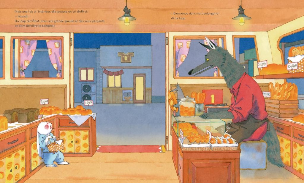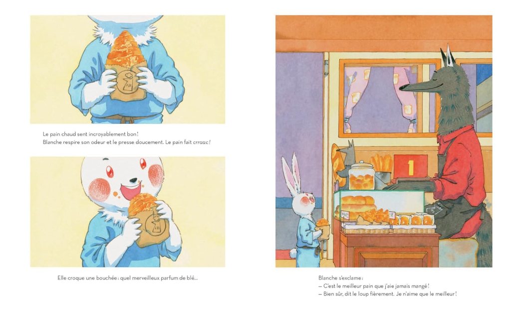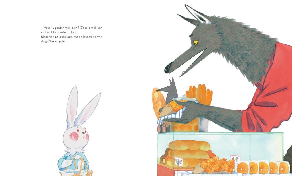 Résumé de La meilleure boulangerie du monde par L’École des Loisirs : Blanche est une lapine très gourmande, toujours à la recherche de mets savoureux. Un soir, elle sent une odeur délicieuse qui s’échappe d’une nouvelle boulangerie : elle ne résiste pas et y entre, mais elle se retrouve nez à nez avec un grand loup terrifiant ! C’est le boulanger qui prépare les meilleurs pains du monde… Que va faire Blanche, à votre avis ?