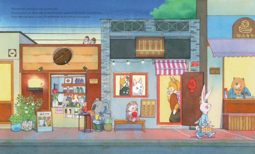 Dans cet univers anthropomorphe, de nuit ou de petit matin, Yue Zhang (traduit du Chinois par Florence Seyvos et Pan Hongye) signe un album dont la douceur gagne sur la dureté de son fauve, pas doué pour les relations avec autrui. Quel bonheur d’être dans l’intimité de ces deux artisans qui se cherchent et ont failli ne pas se trouver. J’ai adoré la finesse de l’auteur, sa créativité (le design de cette boulangerie, pour moi, inédite) et toute cette faune qui apparaît et qu’immédiatement on semble connaître depuis toujours. Un album croustillant, à savourer.