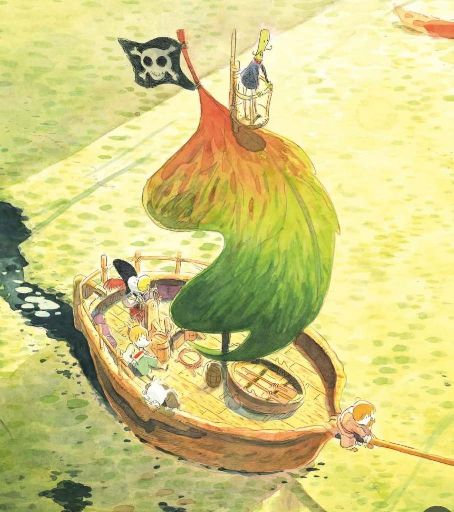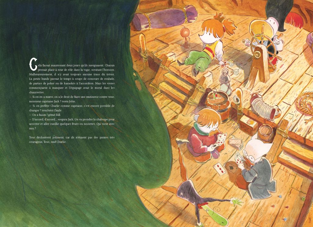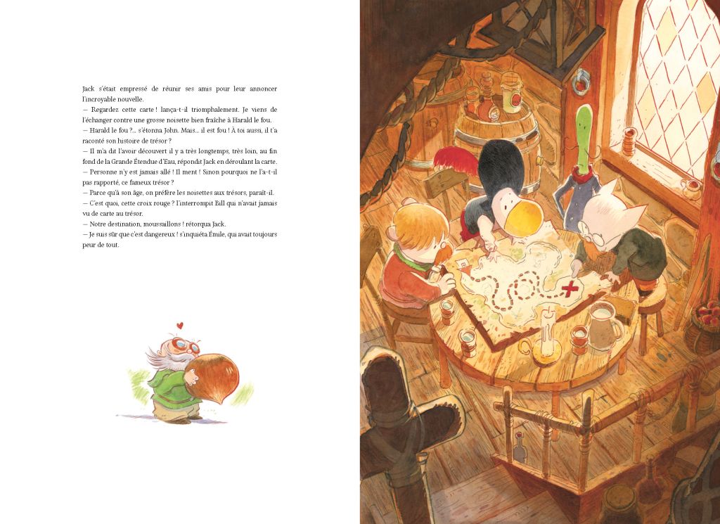 Un tout petit monde! Pour preuve, quand Jack convainc ses amis de partir à l’aventure, à la chasse au trésor, c’est dans une coquille de noix qu’ils conçoivent, avec Charlie la charpentière, la coque de leur bateau. Alors, à leur vue de nez, un petit ruisseau leur semble vite être un océan infranchissable.