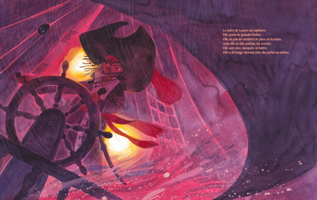 « Il doit être fort et courageux, Lucien, comme un pirate qui n’a peur de rien. » Là-haut, depuis la vigie, sous le jolly roger, il a l’air grand, il fait fort. Et ça l’arrange bien. La mer, il est tombé dedans quand il était petit, il n’a connu qu’elle. Mais il ne faudrait pas qu’il plonge trop en profondeur, qui sait quel monstre pourrait l’y guetter? Sinon, cette vie au large, c’est le calme sur un océan à perte de vue, dans lequel le soleil se baigne en fin de journée, mais aussi les nuits de tempête. À bord de ce bâteau familial, c’est maman qui conduit, navigue, donne les ordres. Papa, lui, est maître d’équipage, cuistot, cartographe, chanteur. Tous les trois ont des perles dans les cheveux.