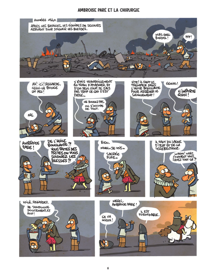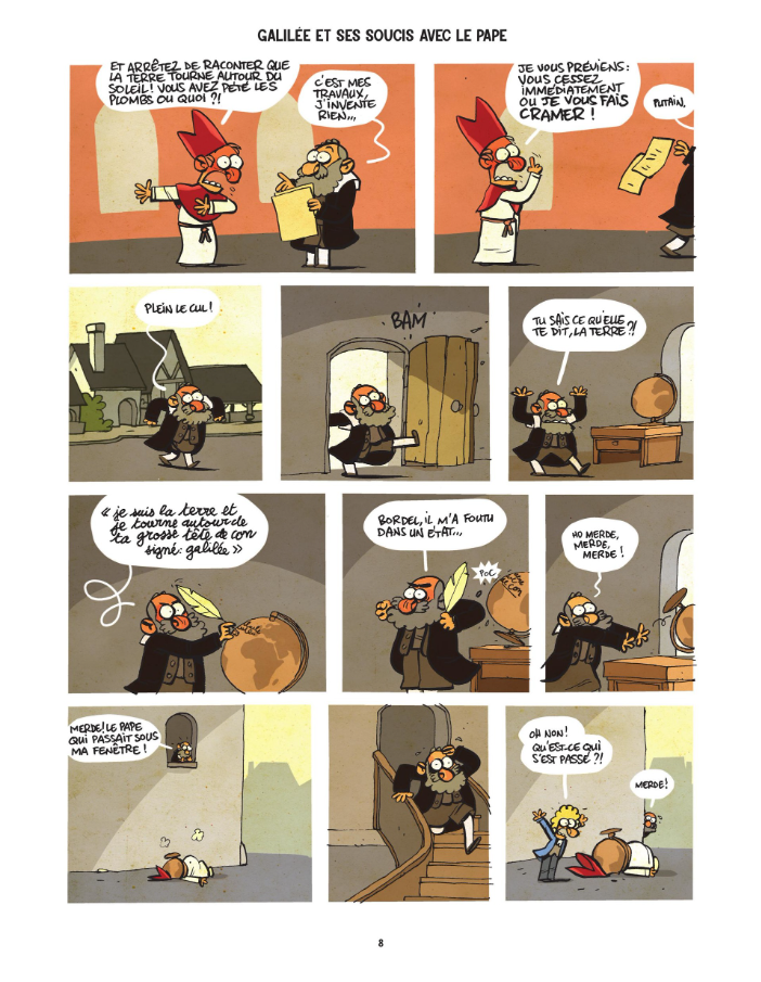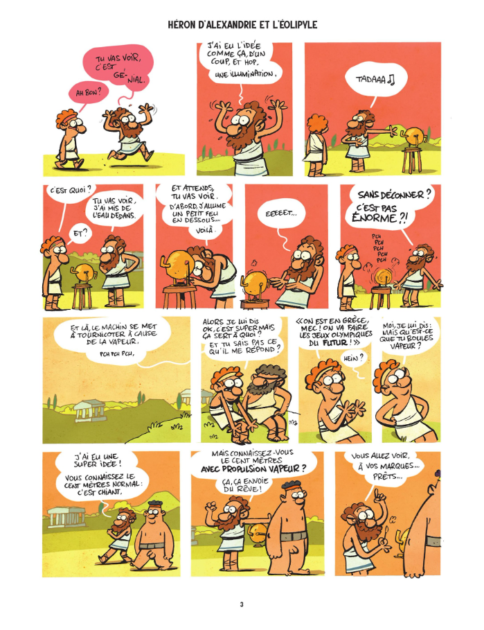 Dans ce second tome, vingt-deux grosses têtes se retrouvent noyées dans le pastiche: de Héron d’Alexandrie d’Éolipyle (qui va vous donner des vapeurs) à Doudna et Charpentier (avec un super-soldat, Trump et Poutine, lisez cet album pour en connaître tous les secrets gniaark gniaark gniaark) en passant par la serial-killeuse Marie Curie ou Galilée le papicide. Bref, voilà de vraies synthèses et vulgarisation, en deux pages à chaque fois, pour les étudiants procrastineurs réussir leurs examens.