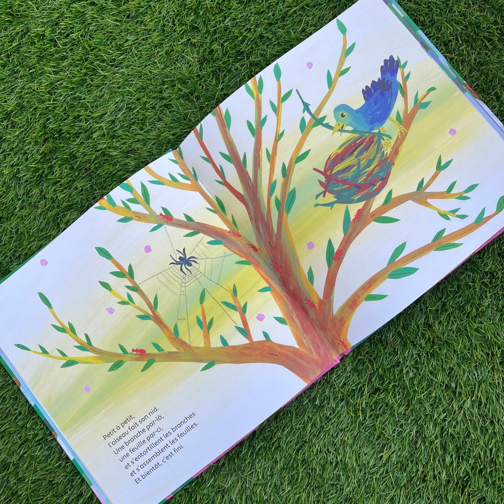Ça tient à quoi un nid, fragile et solide à la fois? « Une branche par là, une feuille par-ci. Et s’entortillent les branches et s’assemblent les feuilles. » Et quand c’est fini? S’il a de la chance, l’oiseau pourra pondre ses oeufs. Si pas, coup de vent ou assaut du chat, tout sera à recommencer, plus robuste, avec de nouvelles idées et trouvailles.