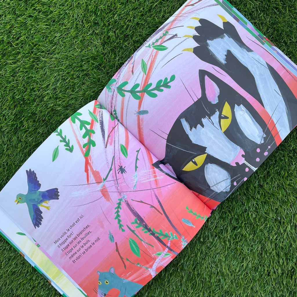 Qu’il est admirable ce petit être qui ne baisse ni les ailes ni les griffes, dans une mise en images et en couleurs très vivante et sensorielle. Ainsi va la vie, magnifiquement représentée par Irène Schoch avec des techniques qui donnent du relief, de la vigueur enfantine. Ainsi va la vie, éclatante et pas toujours en ligne directe. Il y a des embûches.