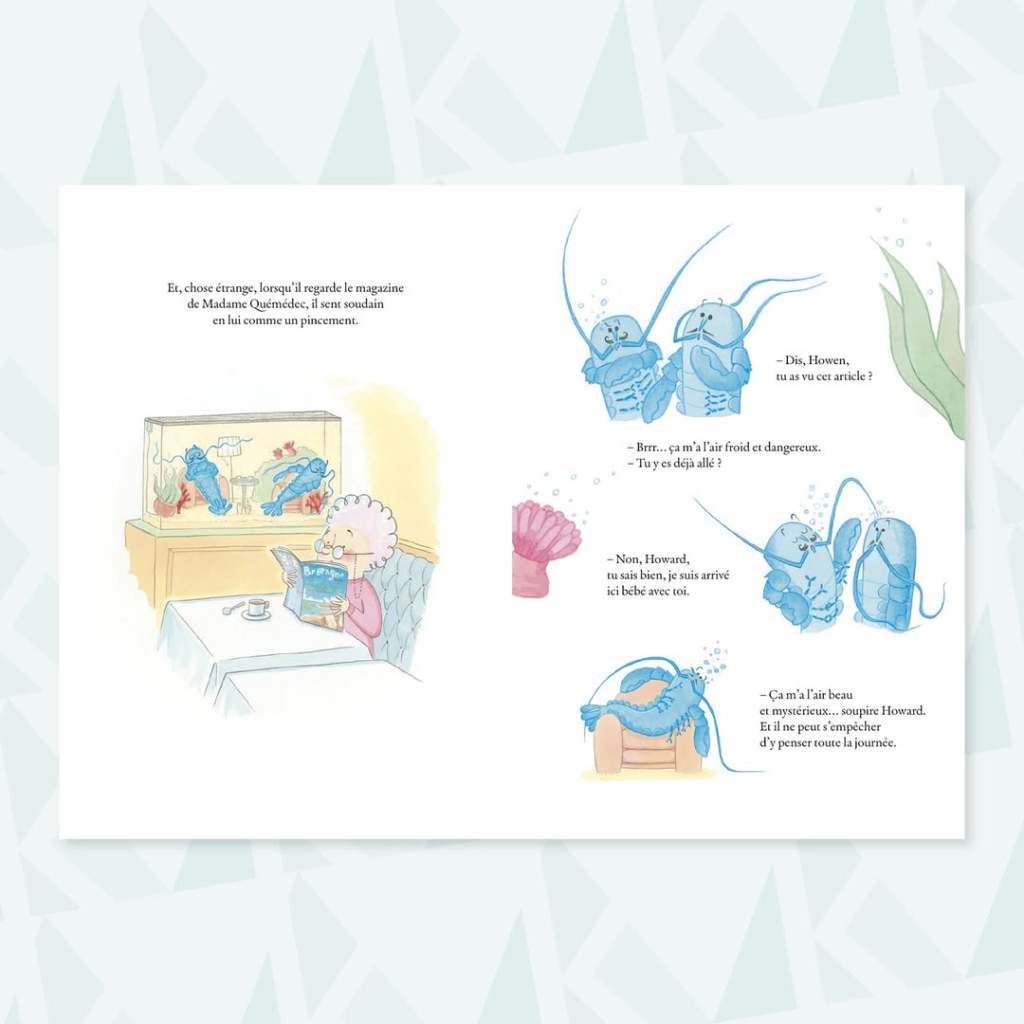 Résumé d’Howard et Howen par L’École des Loisirs (Kaléidoscope): Howard et Howen sont deux homards bleus. Ils coulent des jours tranquilles dans l’aquarium d’un restaurant. Mais, un jour, Howard ressent un étrange pincement : il rêve de découvrir l’océan. Impossible de résister à l’appel du large. Sans plus attendre, le voilà qui détale. Commence alors une folle équipée, portée par un souffle de liberté !